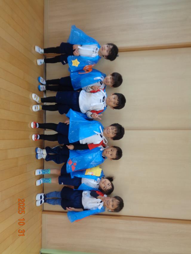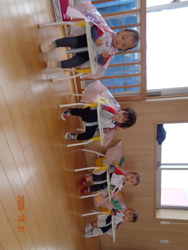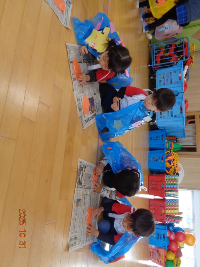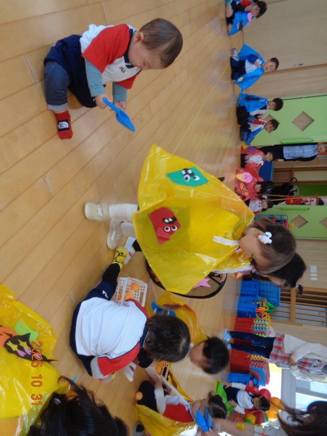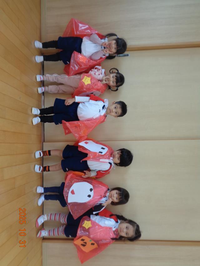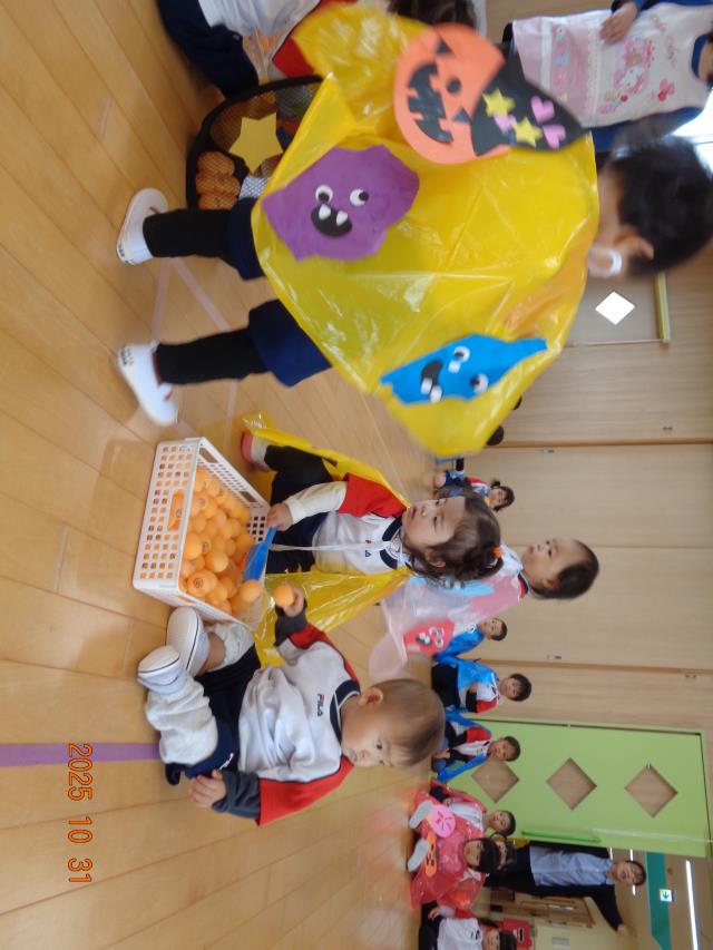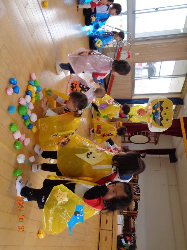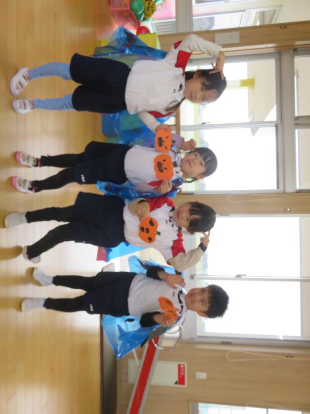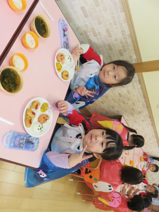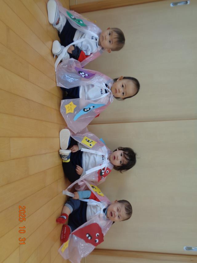 10月31日は、子どもたちの大好きな『ハロウィンパーティー』。パーティーという響きが、子どもたちをワクワクさせ、自分だけのマントを身につけて、笑顔いっぱいで参加していました。歌をうたったり、ゲームをしたり、製作をしたり・・。「トリックオアトリート!」の合言葉でもらったお菓子嬉しかったね。お昼は、みんなでハロウィンランチを美味しく頂きました。( ´∀` )