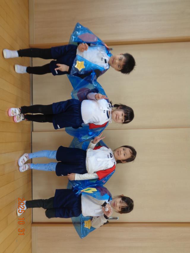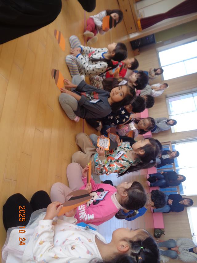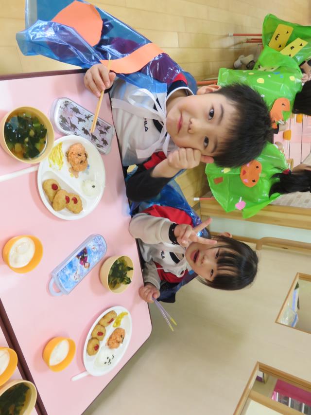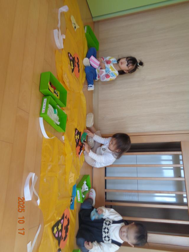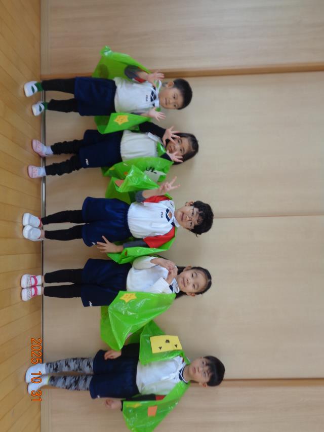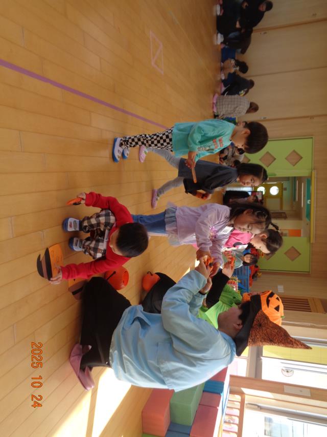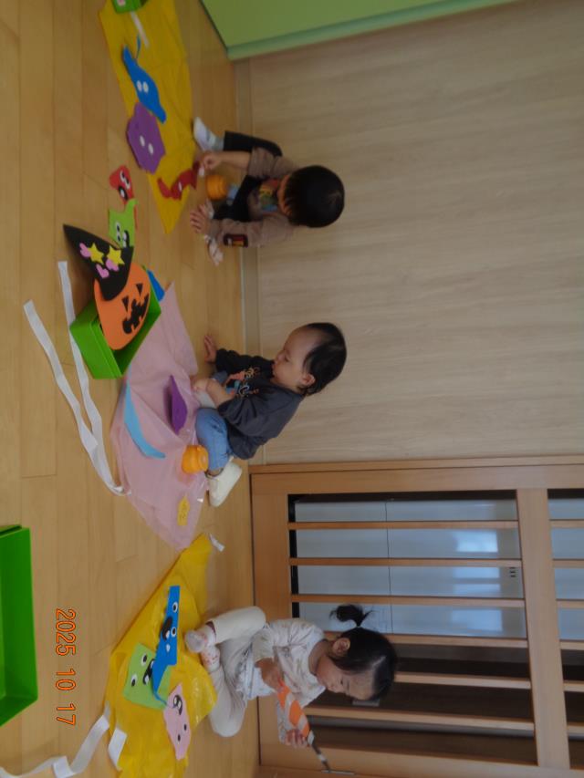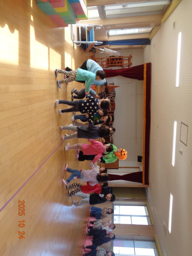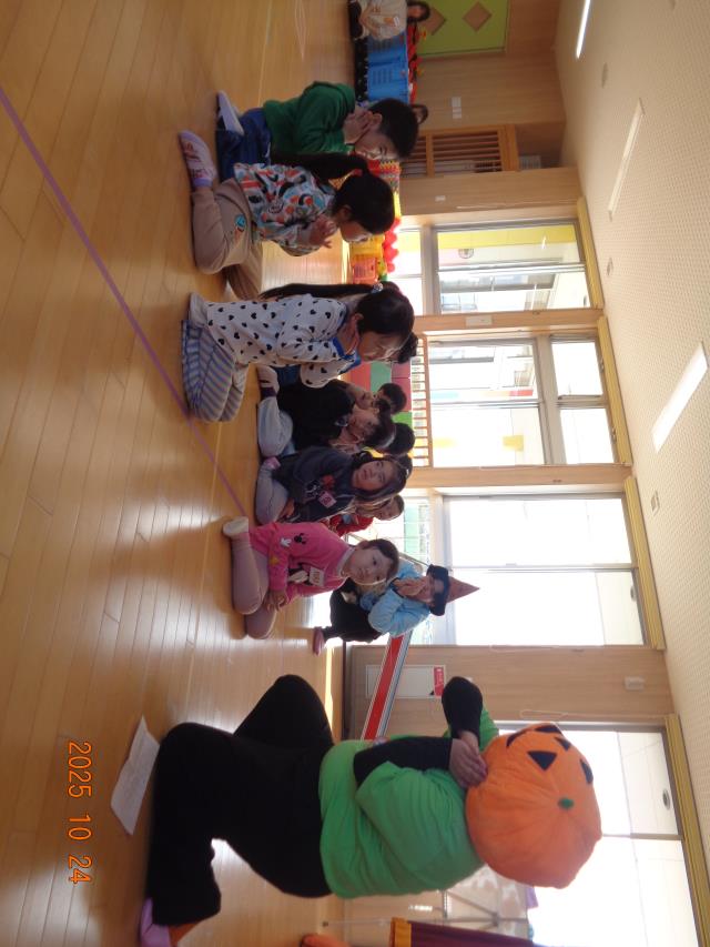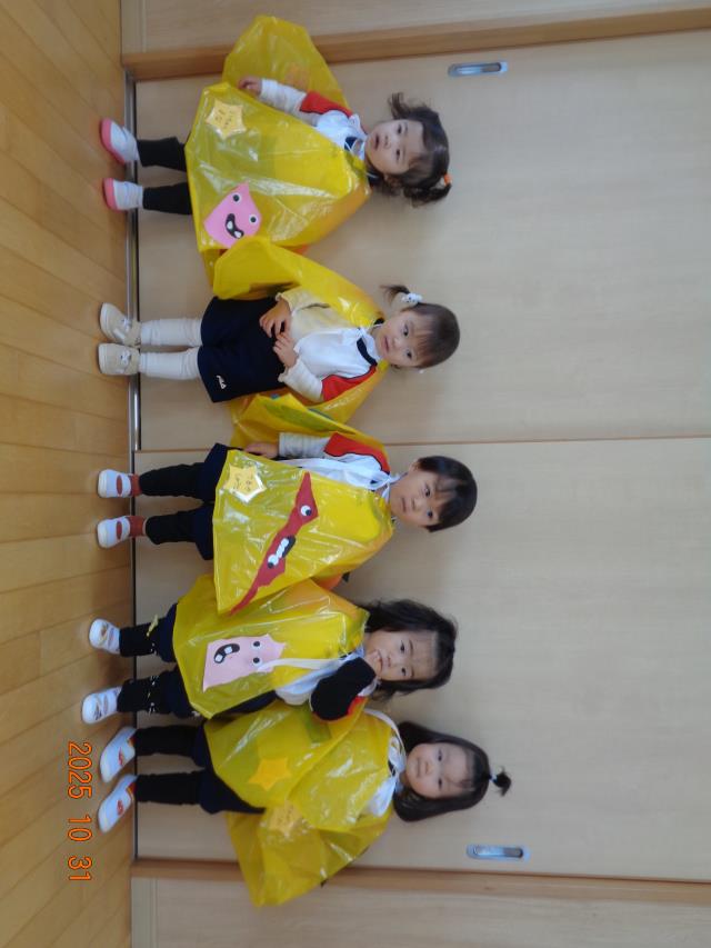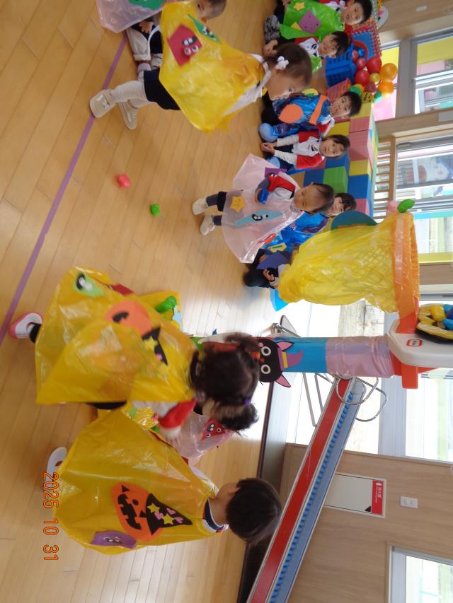 10月31日は、子どもたちの大好きな『ハロウィンパーティー』。パーティーという響きが、子どもたちをワクワクさせ、自分だけのマントを身につけて、笑顔いっぱいで参加していました。歌をうたったり、ゲームをしたり、製作をしたり・・。「トリックオアトリート!」の合言葉でもらったお菓子嬉しかったね。お昼は、みんなでハロウィンランチを美味しく頂きました。( ´∀` )