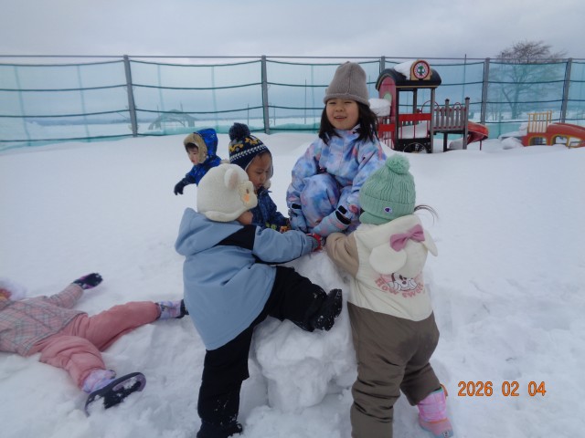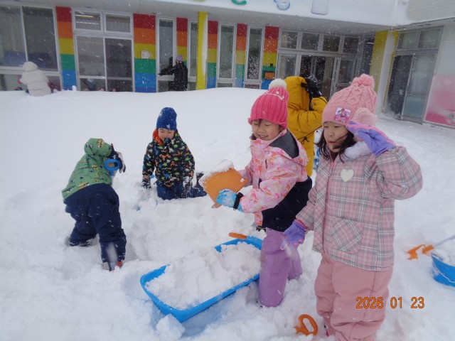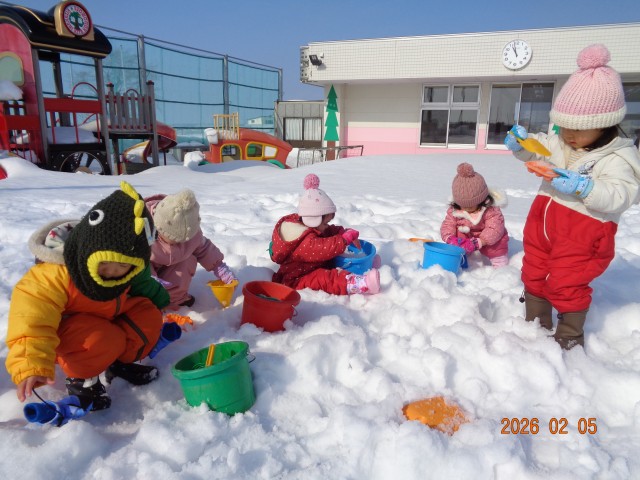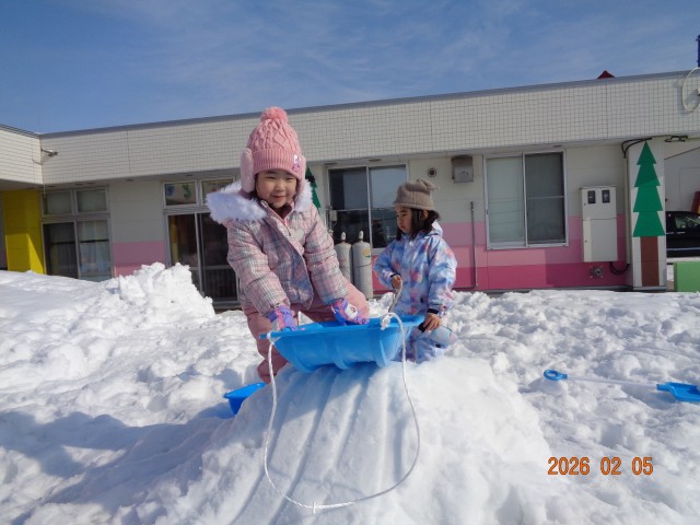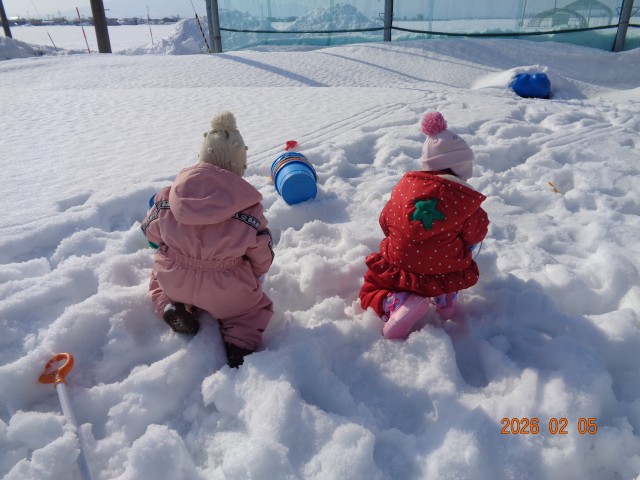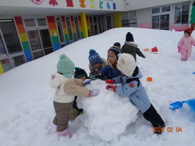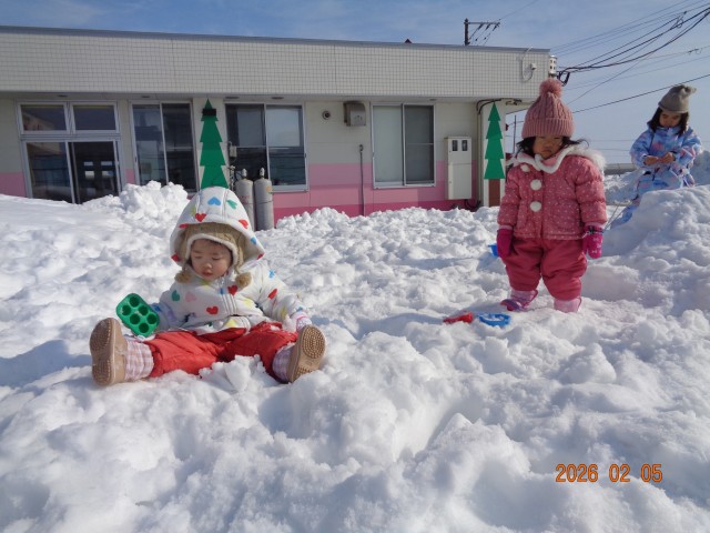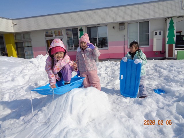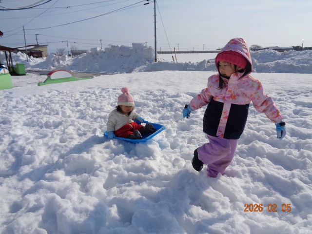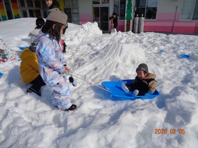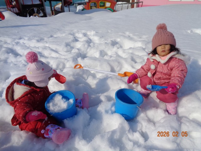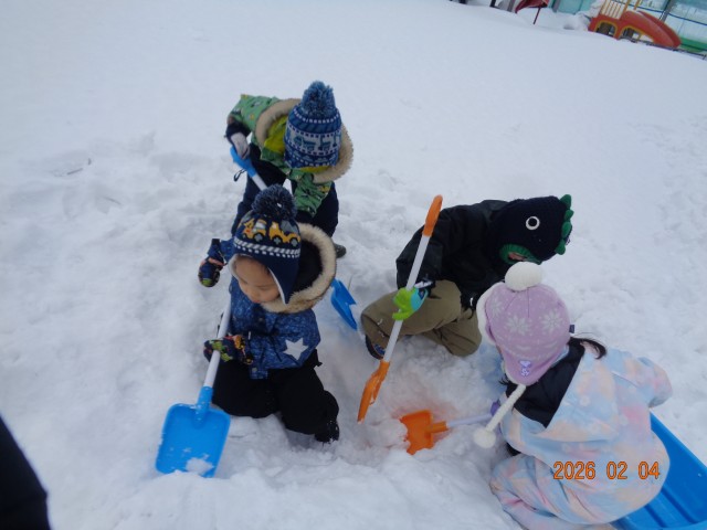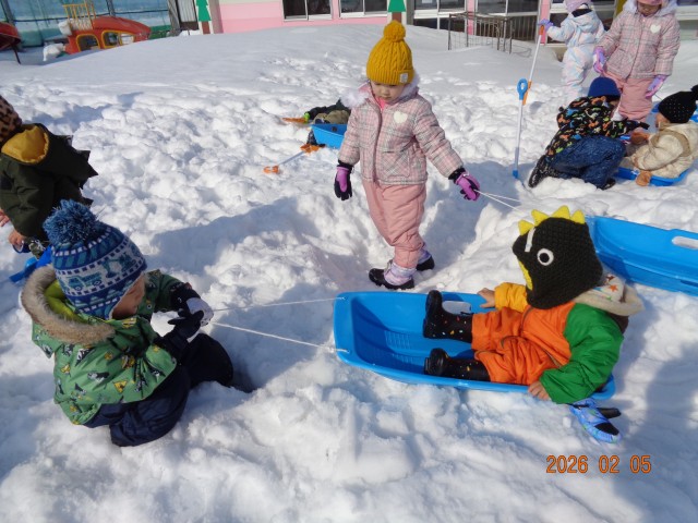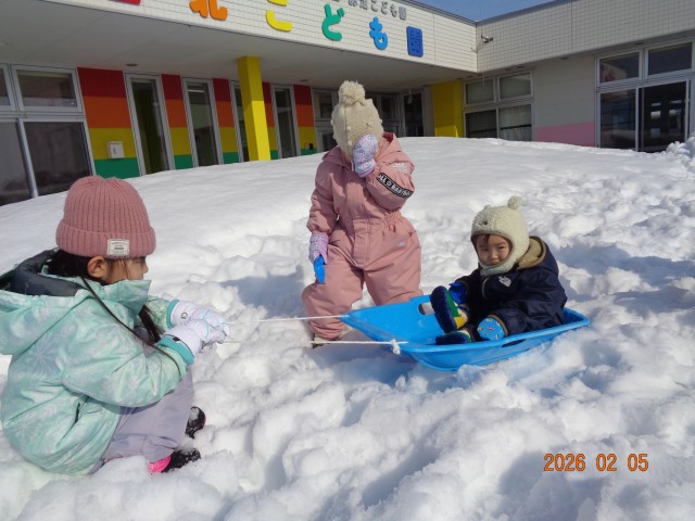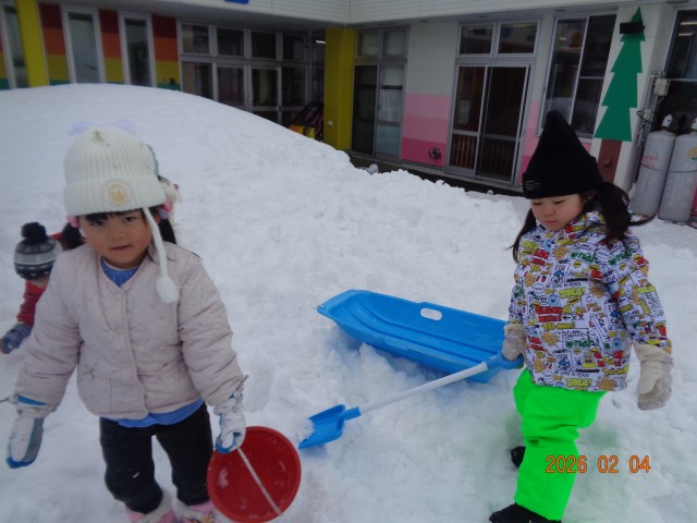 今年は大雪で、天気の悪い日も多かったですが、天気の良い日は園庭に降り積もった雪で遊び楽しみました。雪遊びをしている子どもたちを見ていると、そり遊びを楽しんだり、穴を掘ったり、いろいろな遊びへと発展させたり、ごっこ遊びをしたり( ^ω^)・・・。のびのび遊ぶ子どもたちは、とても頼もしいです。