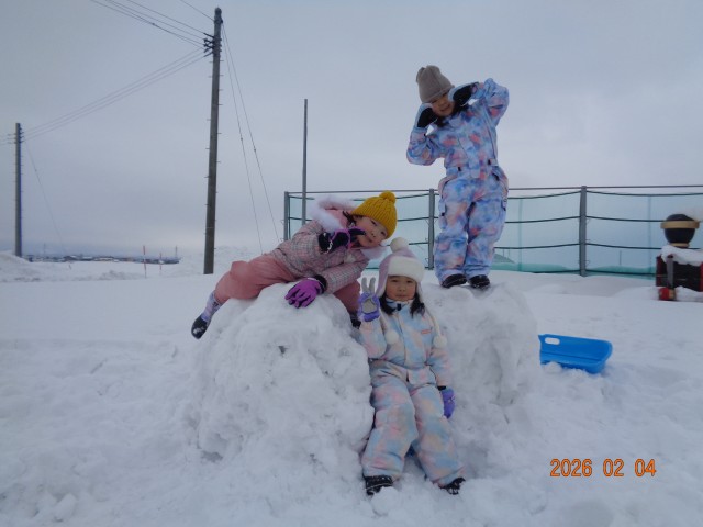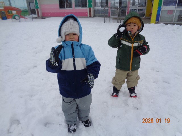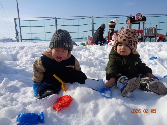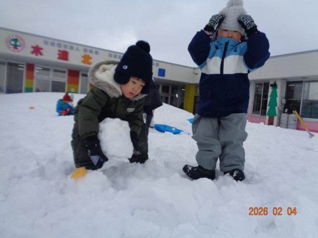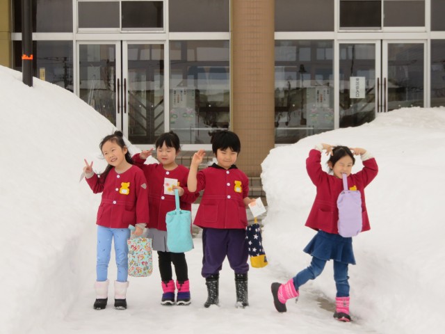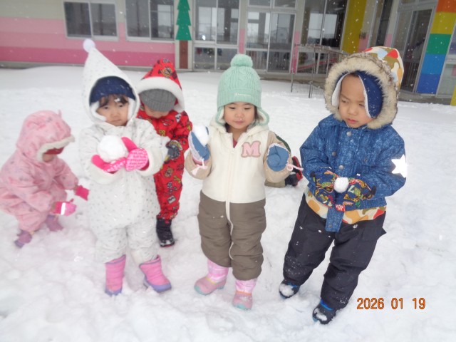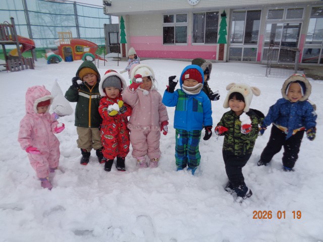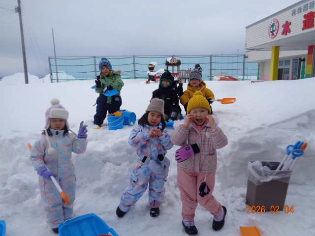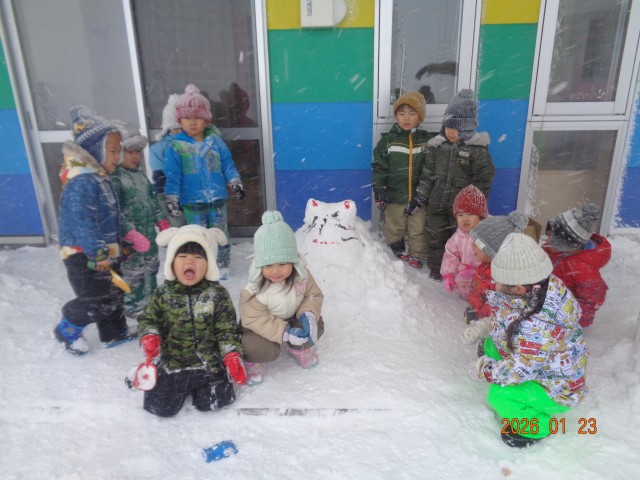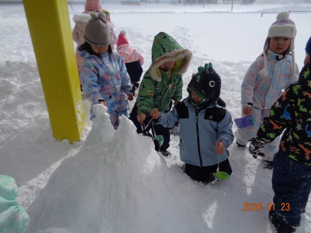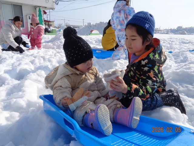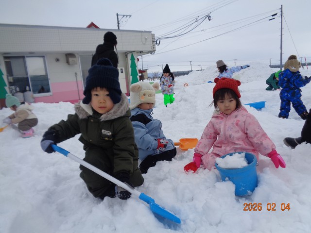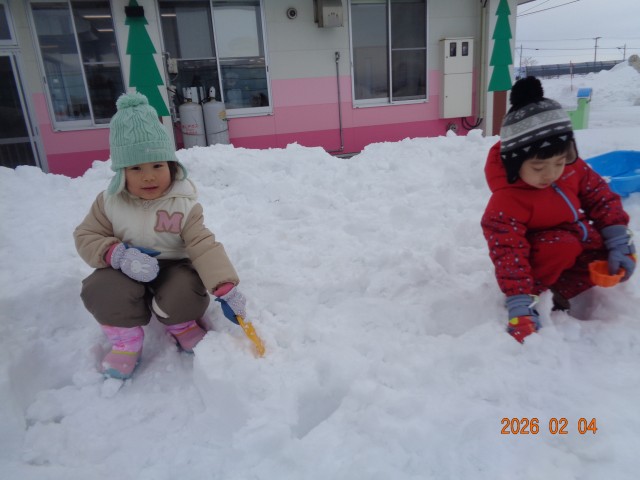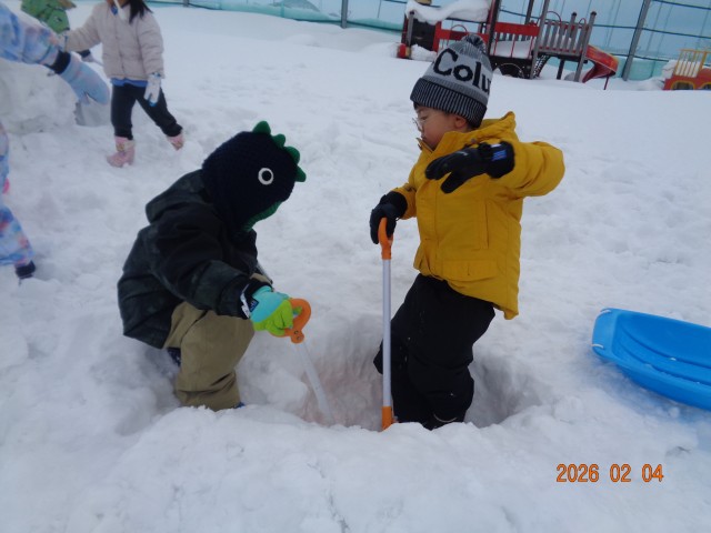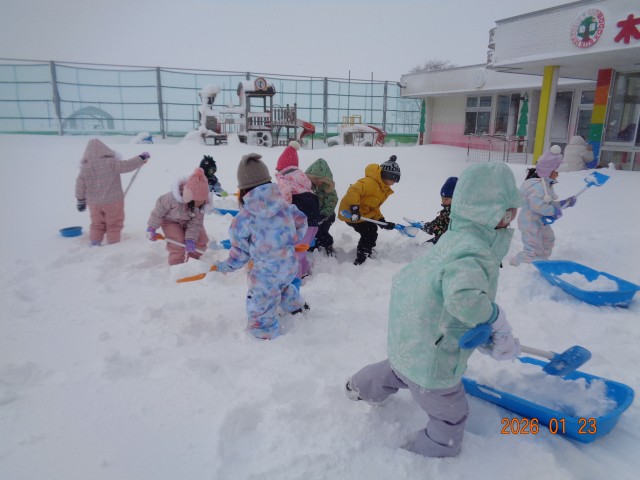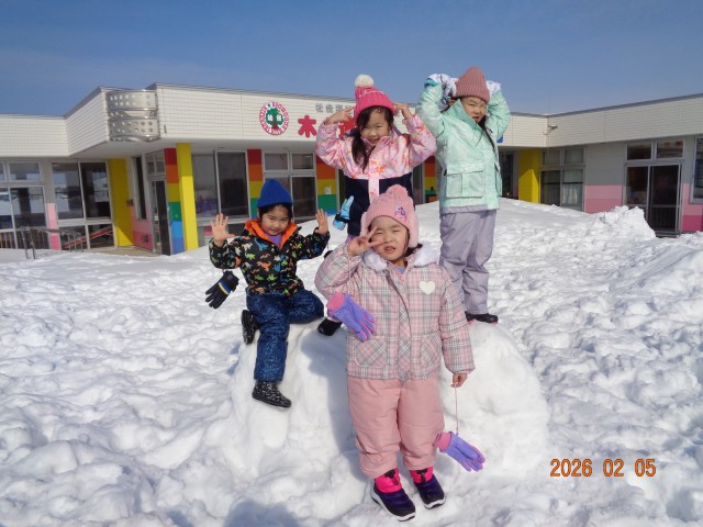 今年は大雪で、天気の悪い日も多かったですが、天気の良い日は園庭に降り積もった雪で遊び楽しみました。雪遊びをしている子どもたちを見ていると、そり遊びを楽しんだり、穴を掘ったり、いろいろな遊びへと発展させたり、ごっこ遊びをしたり( ^ω^)・・・。のびのび遊ぶ子どもたちは、とても頼もしいです。