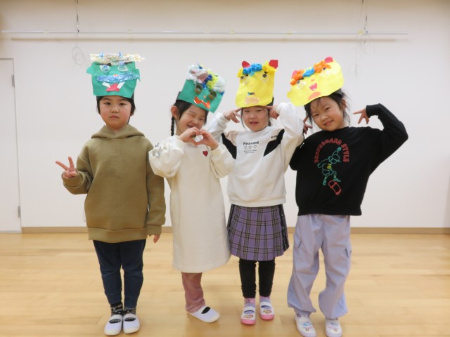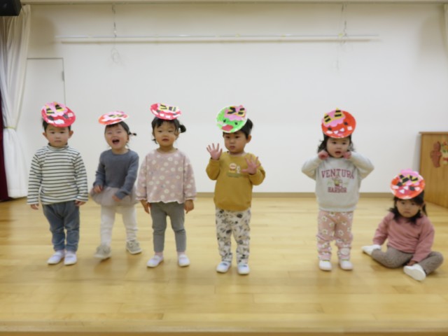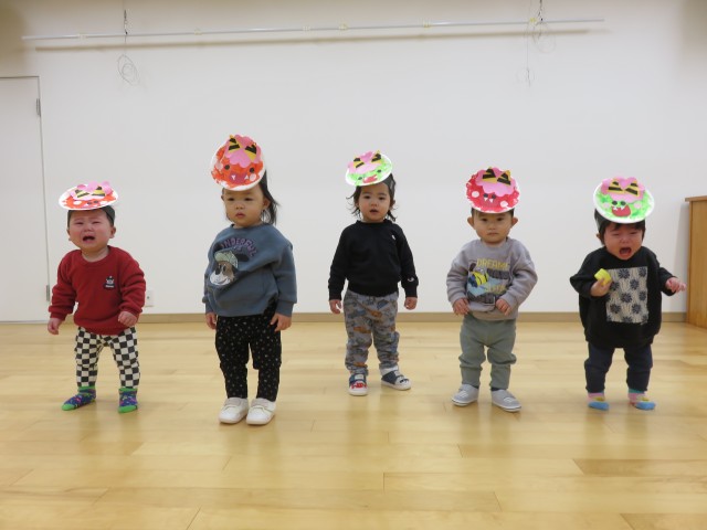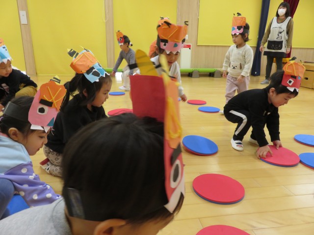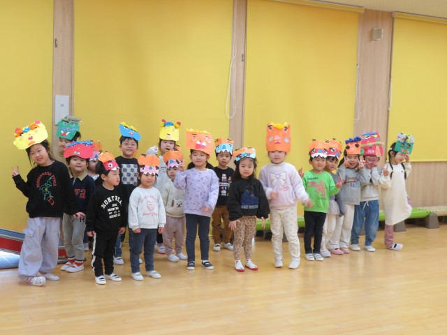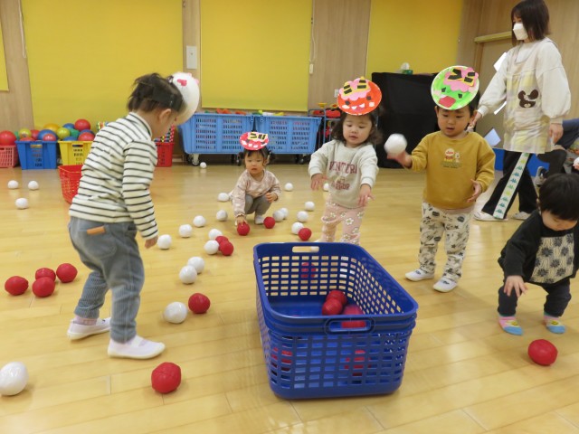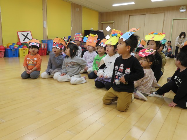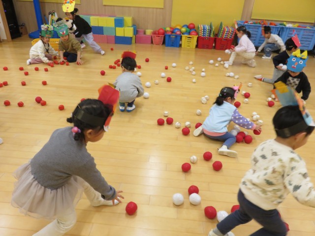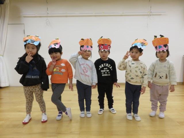 雪あそび会が思うようにできないため、今日は「みかん探しゲーム」をホールで行いました。子どもたちがホール遊びをして片付ける前の環境を利用し、いろいろな表情をしたみかんをいろいろな場所に( ^ω^)・・・。小さい子どもたちから順番に探し、子どもたちもいろんな角度から見て・・、「あったー!」「みつけたー」「どこかなー」「ないー」「ここにあったよー」いろいろな会話が聞こえる中で、見つけた時のみんなの笑顔がとても印象的でした。楽しかったね!!