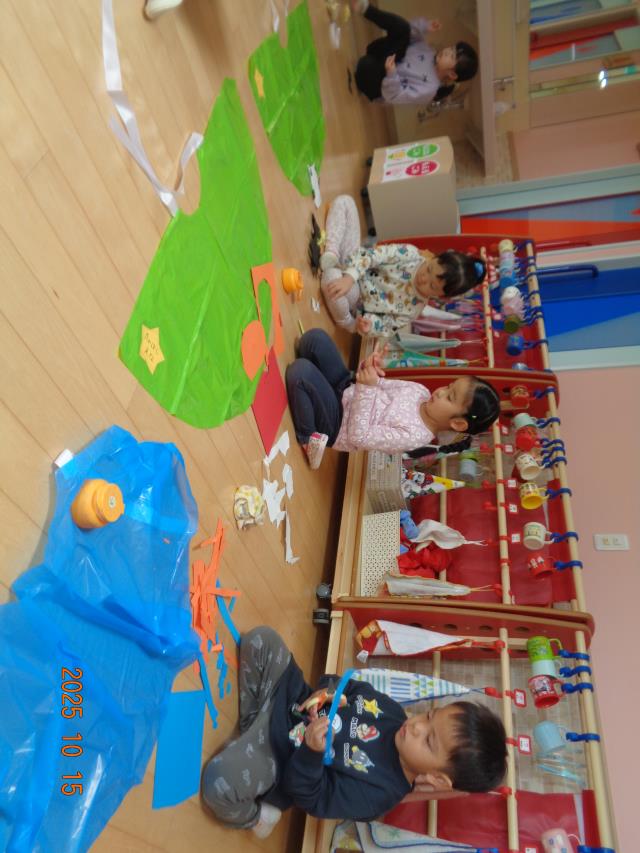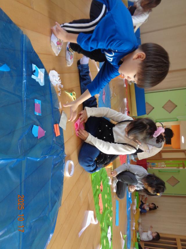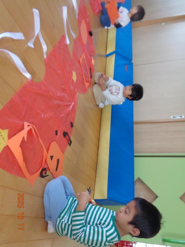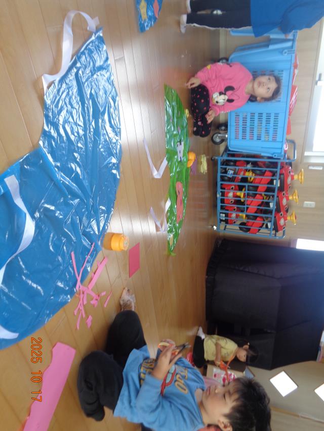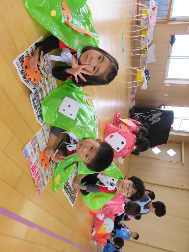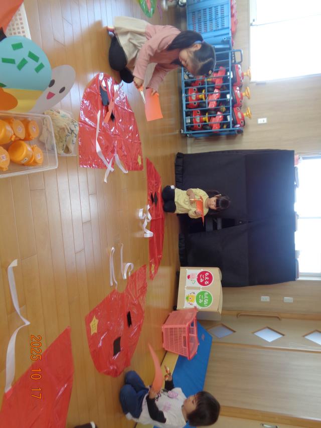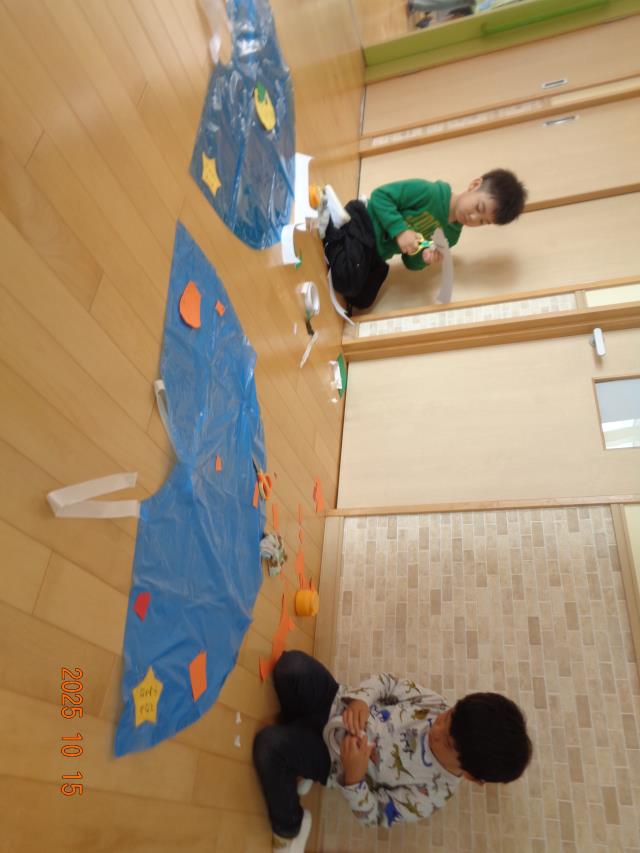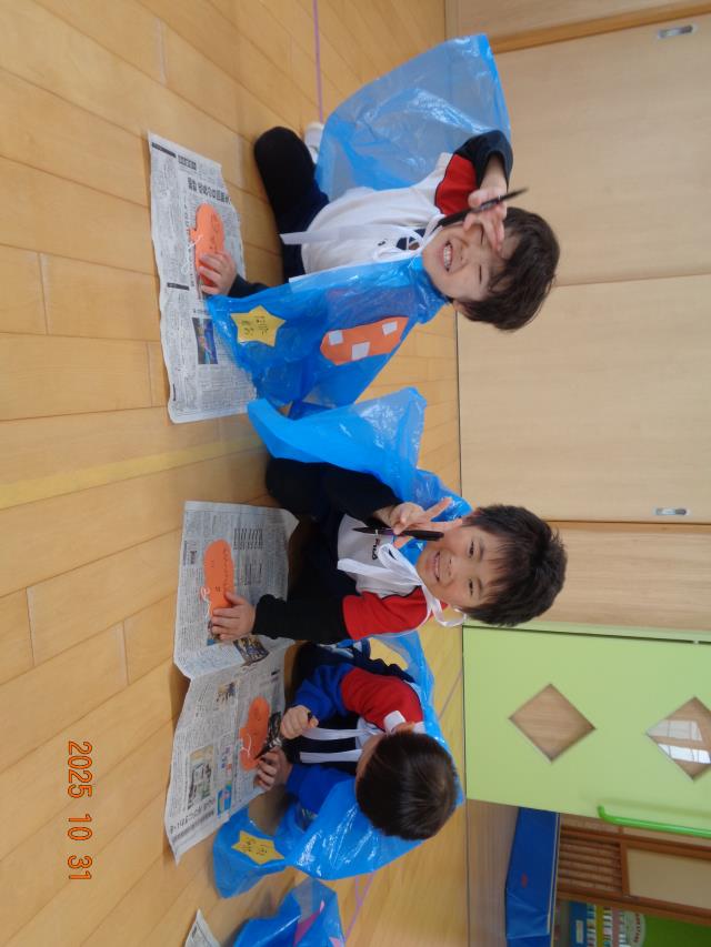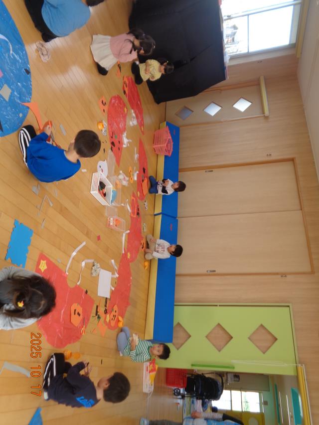 ハロウィンパーティーに向けて、自分だけのマント作りが行われていました。ハロウィンというと・・、「かぼちゃ」「おばけ」「おかし」「モンスター」( ^ω^)。子どもたちなりのイメージがあるようですね。ひとりひとり工夫しながら作っていましたよ!